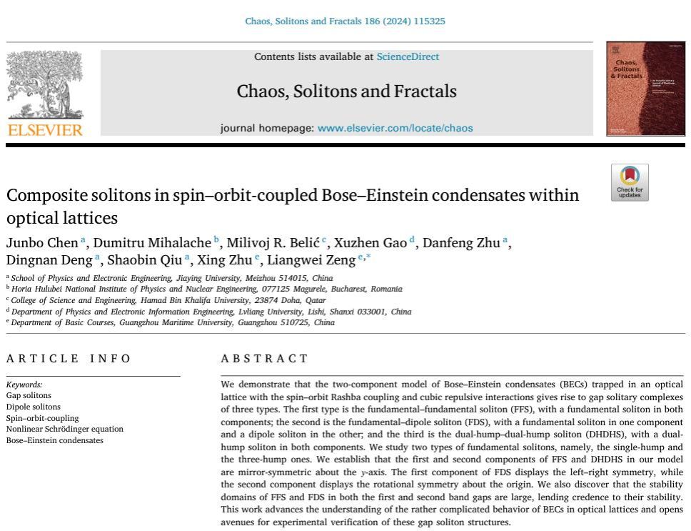 近日,我校物理与电子工程学院教师陈俊波博士以第一作者在中科院1区期刊《CHAOS SOLITONS & FRACTALS》上发表了题为“Composite solitons in spin–orbit-coupled Bose–Einstein condensates within optical lattices”的学术论文。