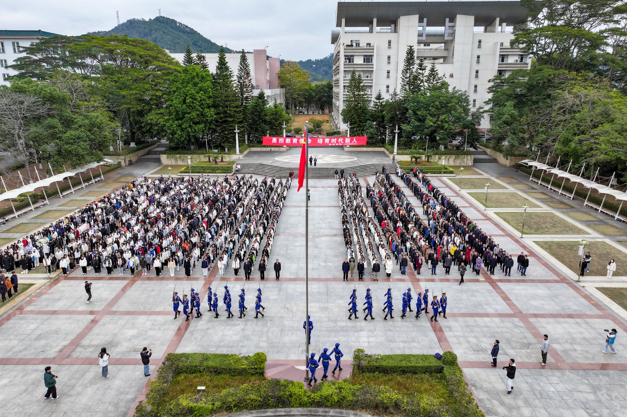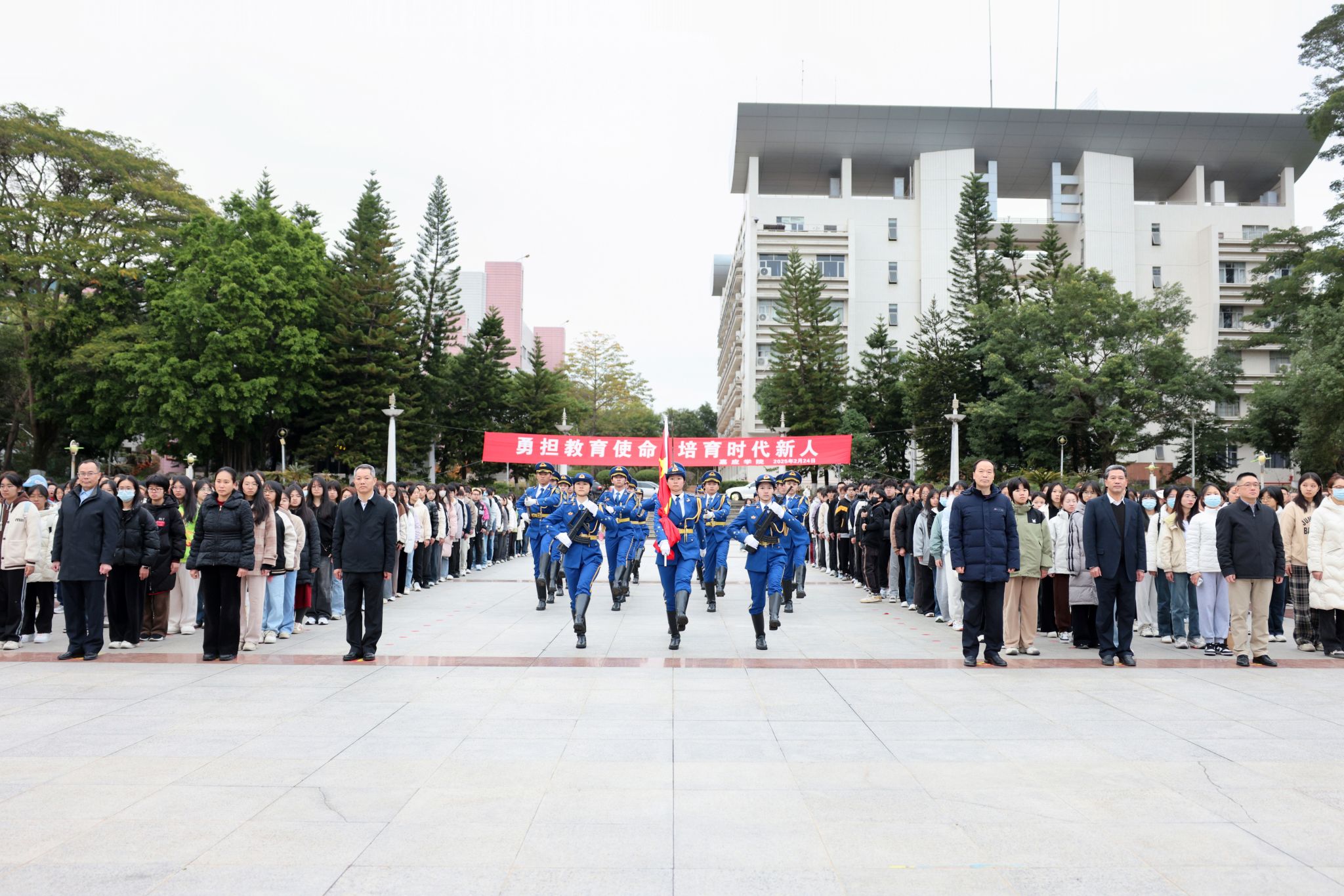 2月24日早上,我校在世纪广场举行新学期升旗仪式。学校领导,各党政群团科研教辅部门、教师教育发展中心、继续教育学院教职工,政法学院和马克思主义学院师生共1500多人共同参加了升旗仪式。
