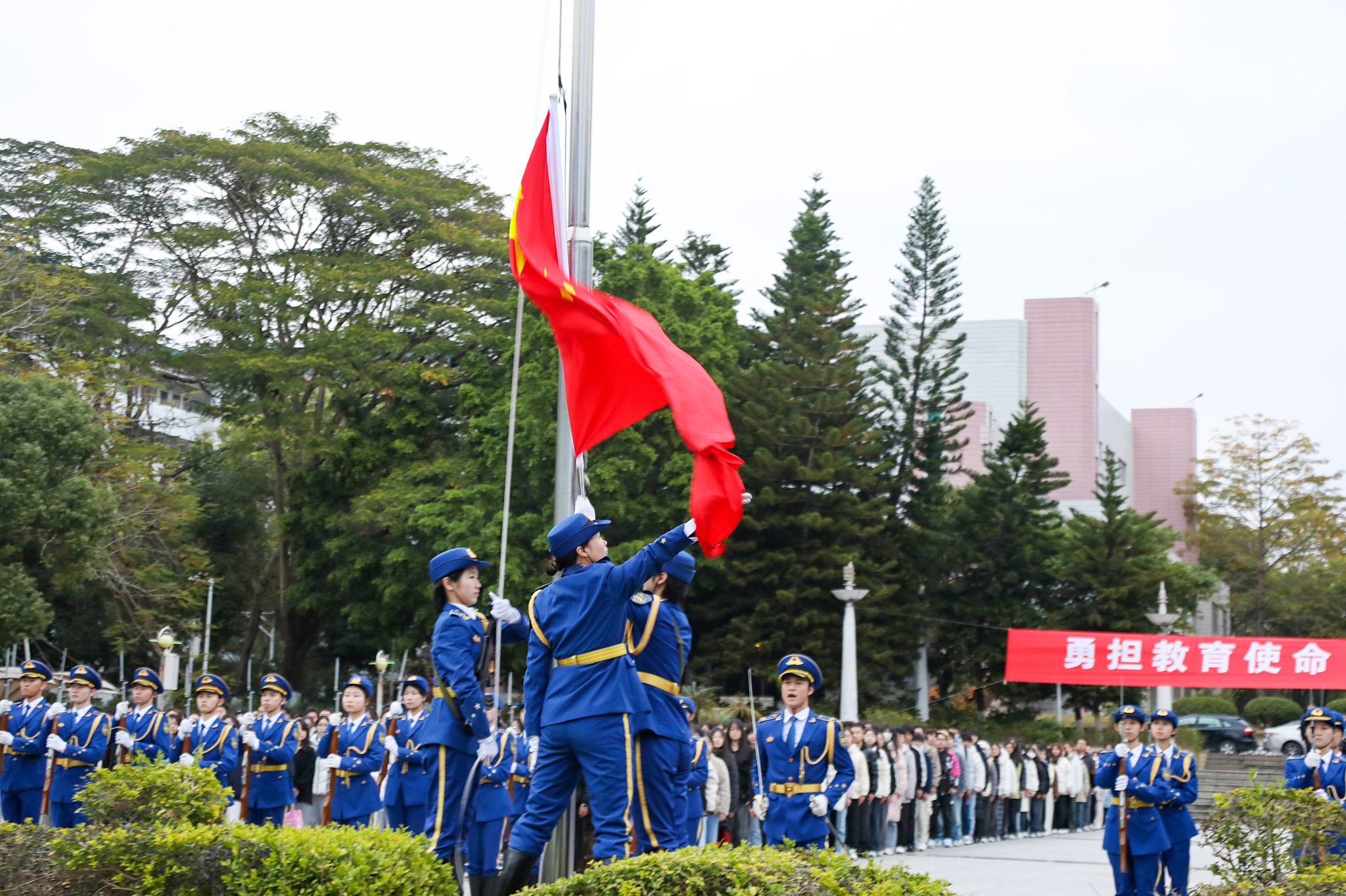 仪式现场,国旗护卫队队员迈着铿锵有力的步伐,护送国旗走向升旗台。在激昂的国歌声中,鲜艳的五星红旗冉冉升起,全体师生庄严肃立,向国旗行注目礼,高唱国歌。