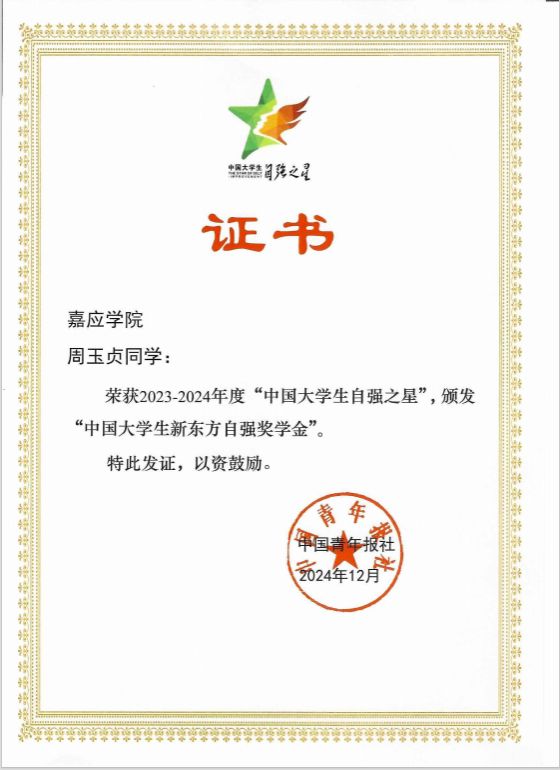 近日,我校化学与环境工程学院周玉贞同学经过层层选拔,获评2023—2024年度“中国大学生自强之星”称号,并被授予“中国大学生新东方自强奖学金”。