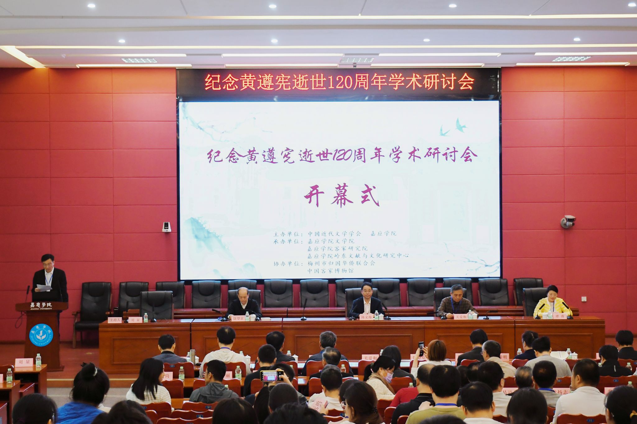 3月28日上午,“纪念黄遵宪逝世120周年学术研讨会”在我校百年纪念大楼121室顺利召开。研讨会由中国近代文学学会和嘉应学院联合主办,我校文学院、客家研究院、岭东文献与文化研究中心承办,梅州市归国华侨联合会、中国客家博物馆协办。我校党委书记陈文海,中国近代文学学会会长关爱和、谭嗣同先生的玄侄孙女、湖南省谭嗣同爱国公益基金会理事长谭裔,中国社会科学院文学研究所副所长饶望京,粤港澳大湾区名人与大学文化研究中心杨宏海,以及来自马来西亚以及国内北京、四川、山东、浙江、福建、湖南、广东等多个省市的100余位嘉宾和专家学者参加了会议。黄遵宪先生的外来孙,加拿大阿尔伯塔省就业、经济和贸易部主任游耀钧发来视频致辞。