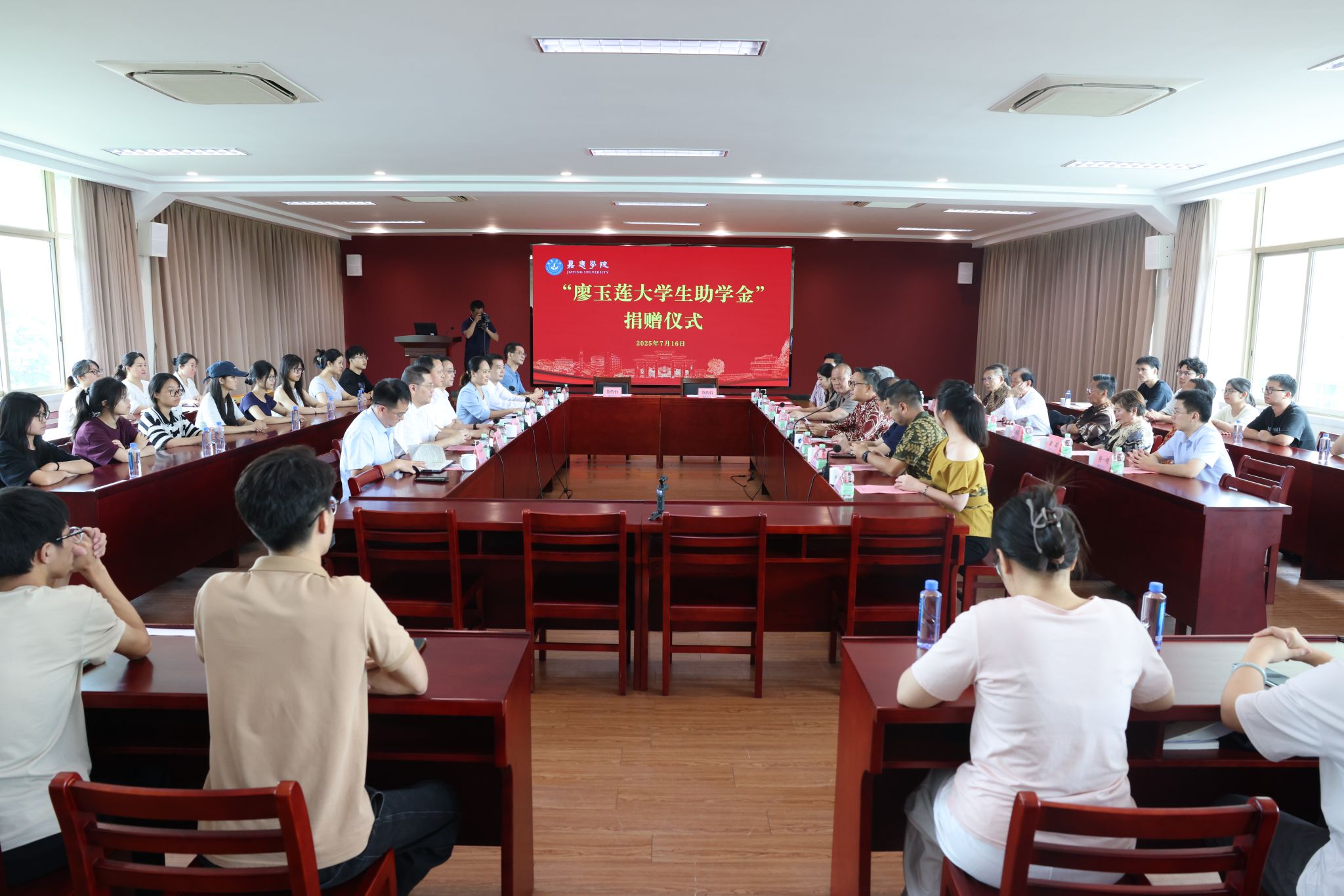 7月16日上午,“廖玉莲大学生助学金”捐赠仪式在何侨生大楼 526 会议室举行。梅州籍印尼华侨温华征先生及梅县区交通运输局、海外联谊会、侨联会相关单位负责人等一行16人,学校党委书记陈文海、副校长张丽霞,党政办公室、发展规划部、审计工作部、学生工作部、对外交流合作部负责人及师生代表参加了捐赠仪式。捐赠仪式由张丽霞主持。