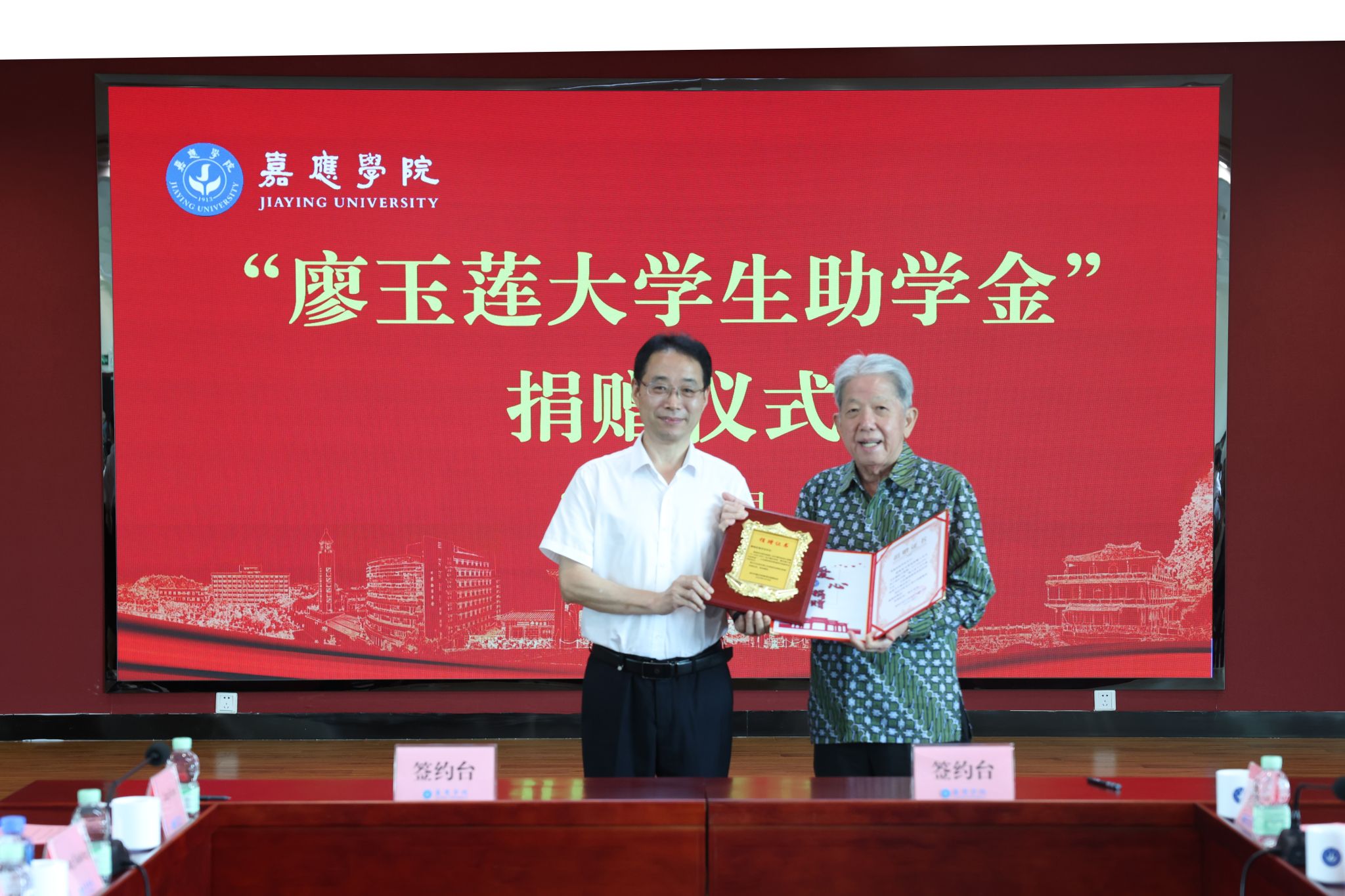 捐赠仪式上,陈文海与温华征还进行了捐赠牌匾和捐赠证书的交接。温华征与学校教育发展基金会代表签署了捐赠协议。与会人员共同观看了嘉应学院宣传片。