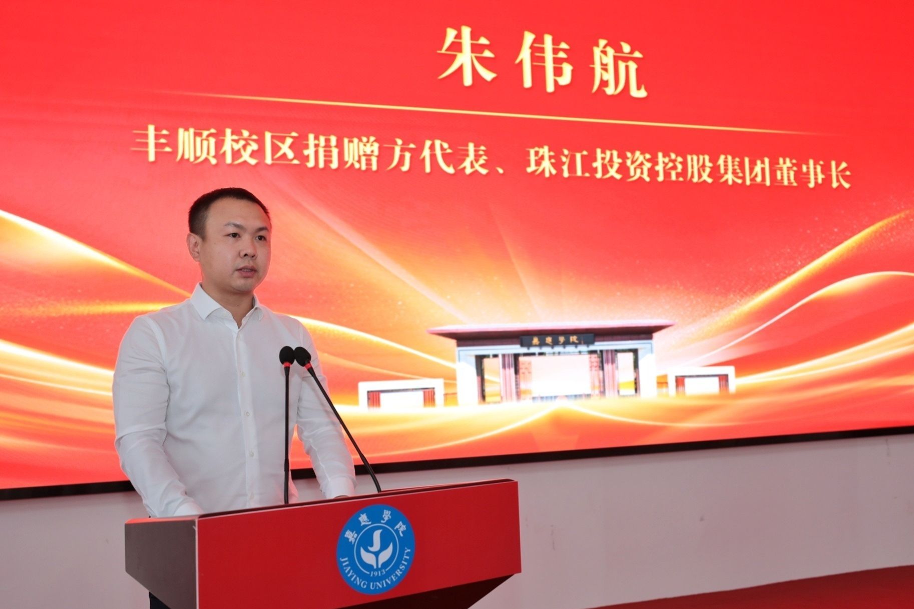 丰顺校区捐赠方代表朱伟航回顾了校区建设历程,他表示,相信丰顺校区(紫琳学院)在未来一定能培养大量人才,为粤东地区高等教育注入新的活力,未来将继续坚守这份教育情怀,全力配合校区各项建设与发展,创造更好的条件,也衷心希望广大贤达一起支持丰顺校区发展,共促家乡的教育事业再上新台阶。