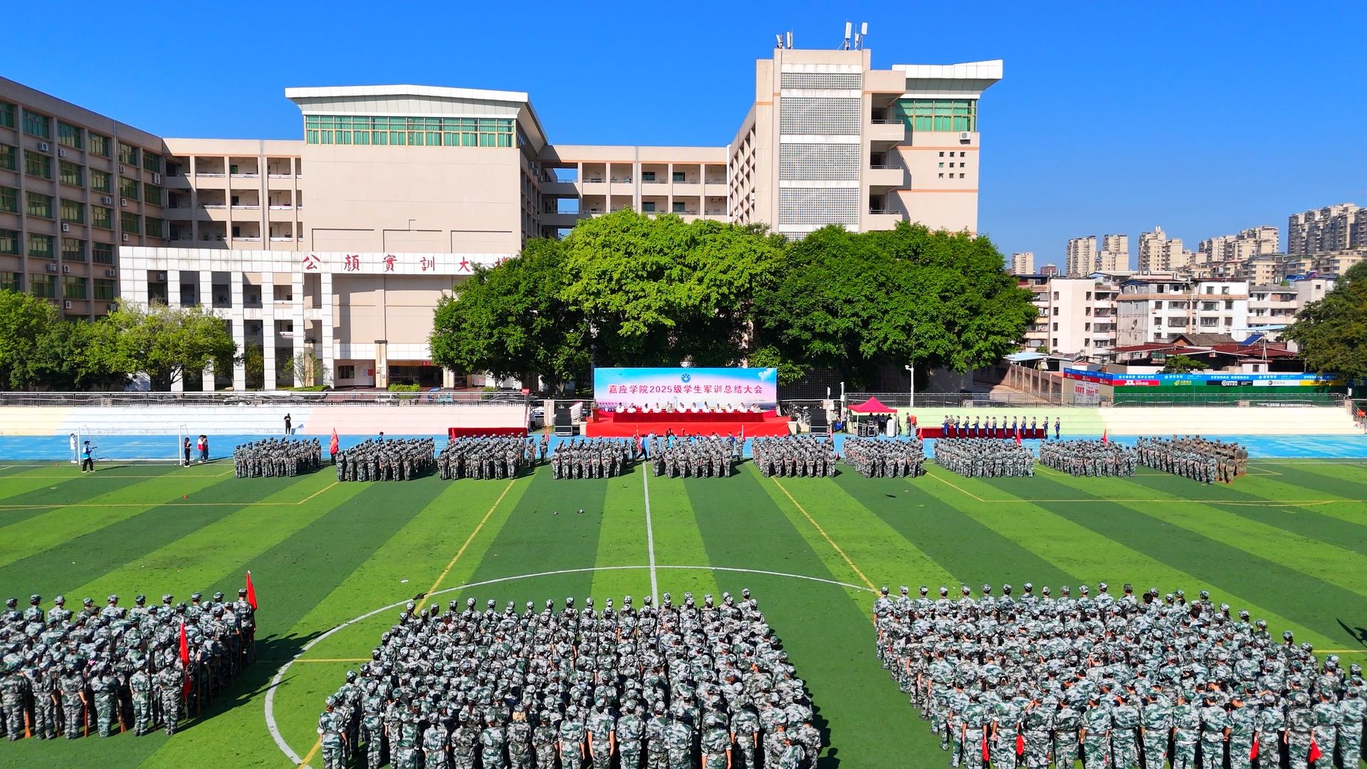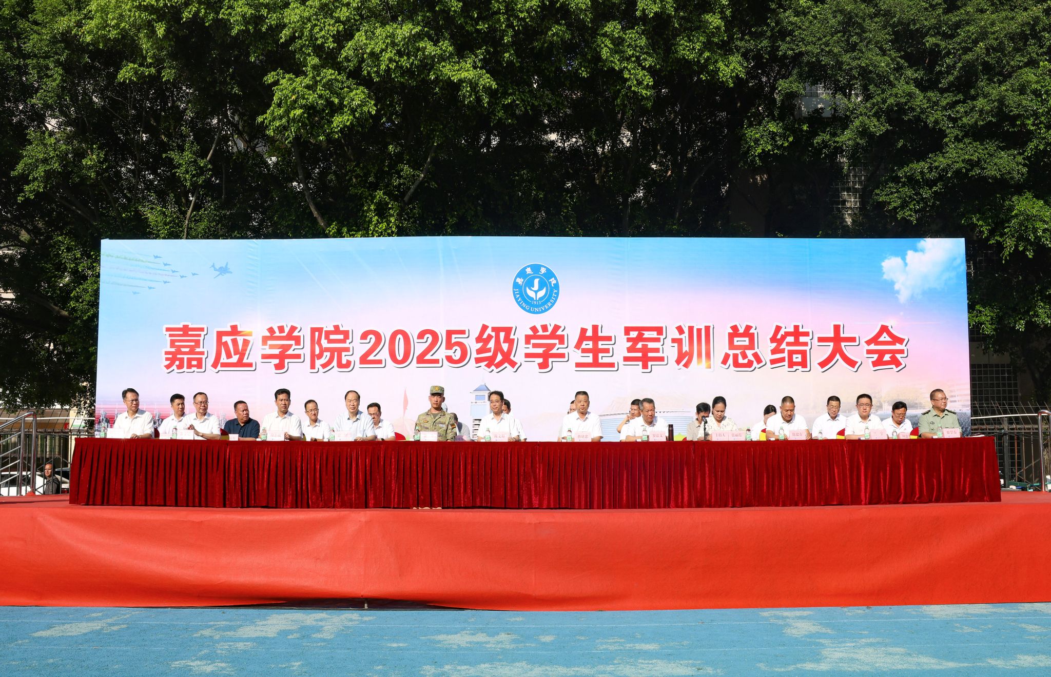秋阳淬迷彩,结营展锋芒。9月28日上午,我校在中区运动场举行2025级学生军训总结大会。学校党委书记陈文海,校长曹建忠,副校长罗嘉文、袁铎、张丽霞、廖志成、陈建存,学校纪委书记苏文记,中山大学帮扶队队长兰宇,学校党委常委钟凯雄,承训部队96715部队军训团副团长贾卓以及“2025级学生军训团”成员、参训学院辅导员及校本部参加军训的2025级新生等参加了本次军训总结大会。陈文海向承训部队赠送锦旗。张丽霞主持大会。廖志成作军训总结讲话。学校领导为获得会操前四名的学院和军训工作优秀指挥员、优秀教官和优秀军训标兵颁奖。程江校区和黄塘校区军训总结大会同步进行。