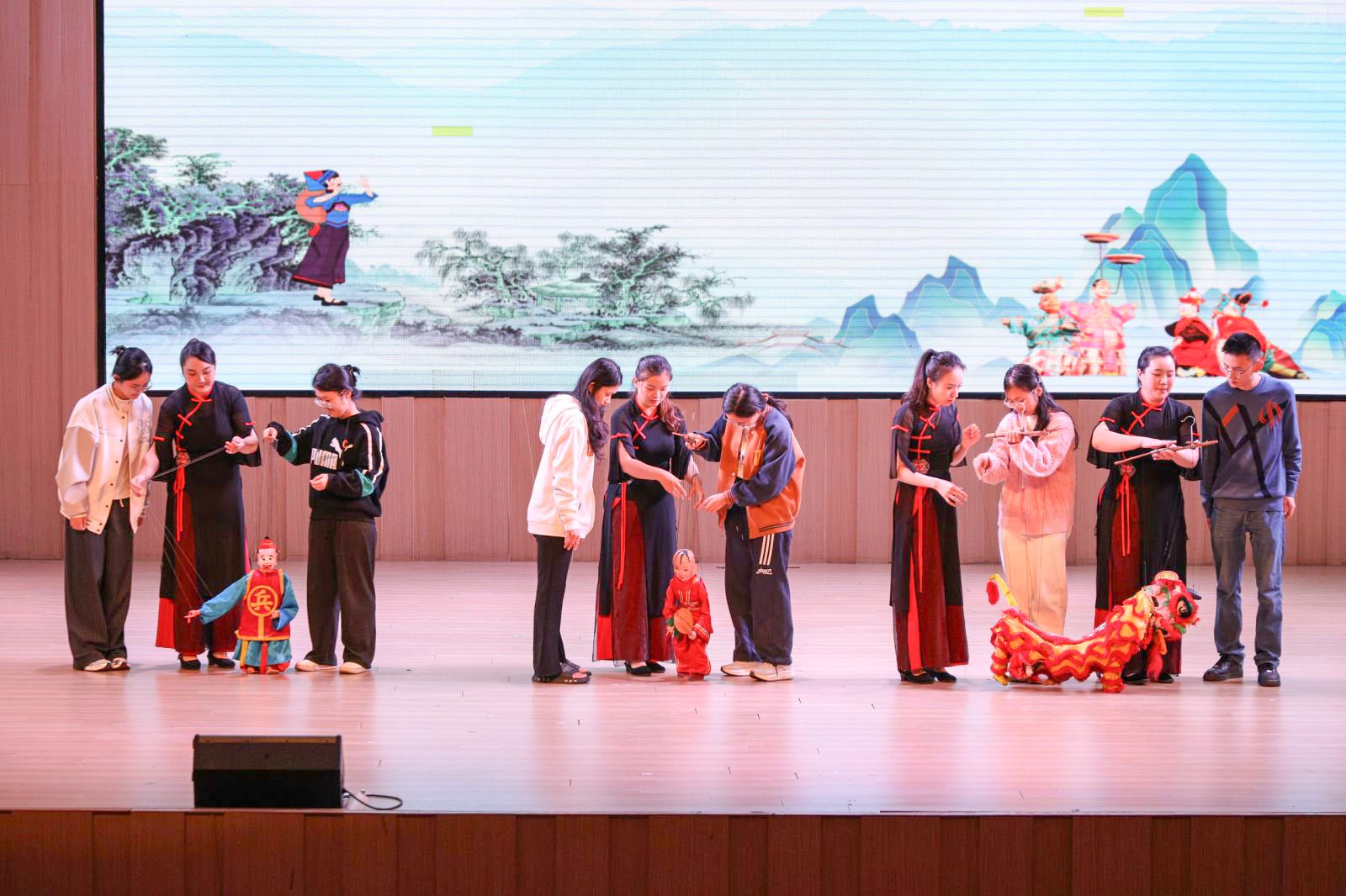 演出设置的教学互动环节同样精彩纷呈。非遗传承人与师生面对面交流,详细讲解提线木偶、杯花、五句板等非遗项目的历史渊源、制作工艺与表演技巧,并邀请师生上台亲身体验。同学们踊跃参与,在传承人的耐心指导下尝试操控木偶、击打杯花,亲身感受非遗艺术的独特魅力。同学们表示,教学互动体验让原本“遥远”的非遗文化变得触手可及,不仅增进了对客家传统文化的了解,更激发了主动传承和弘扬中华优秀传统文化的热情。