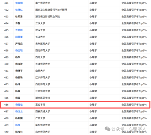 近日,2025年度全国心理学领域高被引学者名单正式发布。我校教育科学学院杨青松教授、王艳辉博士凭借其卓越的学术贡献和广泛的研究影响力,成功入选全国心理学领域高被引学者Top 5%。该名单由权威学术机构依据研究成果的被引用频次、学术影响力、创新性等多项核心指标进行综合评估与严格筛选,最终确定入选者。