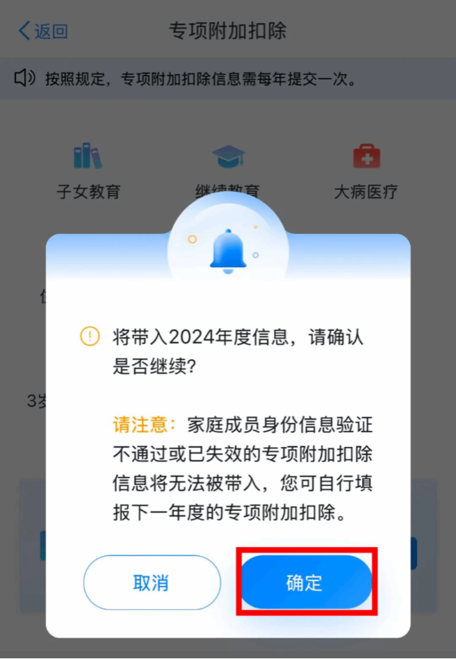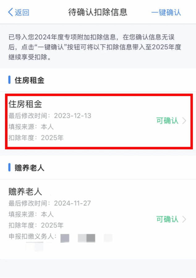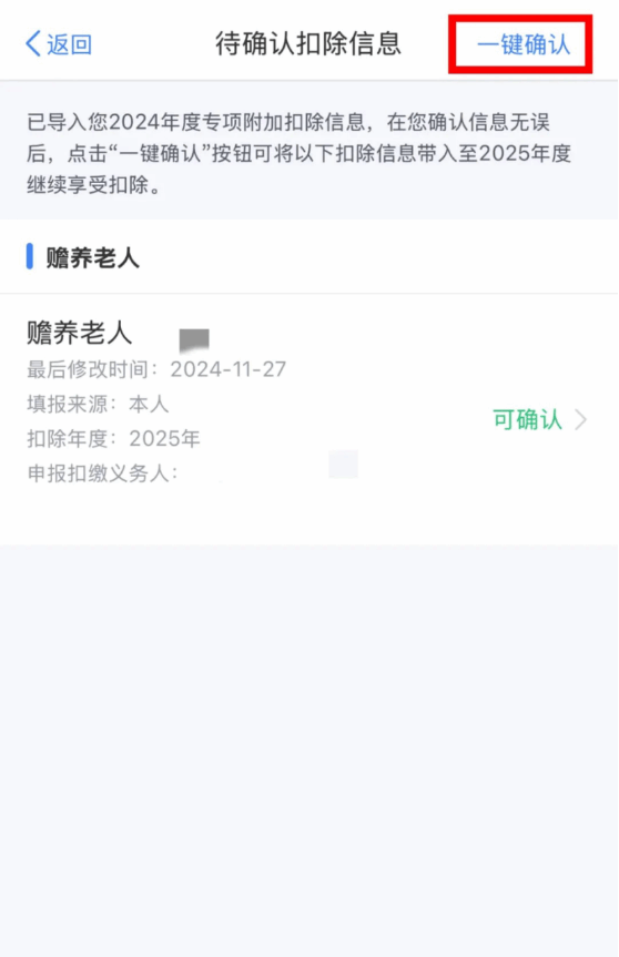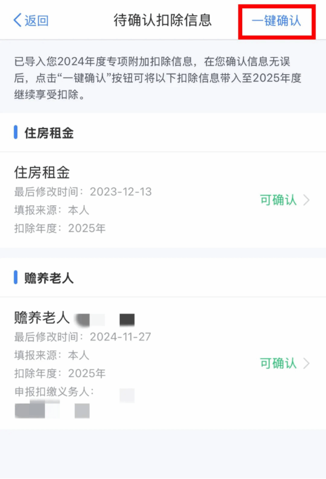 2025年还有其他继续享受的专项附加扣除,则在确认后再点击【一键确认】完成信息提交。