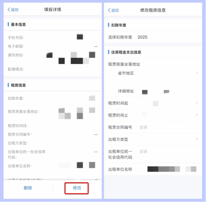 以住房租金专项附加扣除修改为例,在待确认扣除信息界面,点击【可确认】,再点击【修改】后进入修改页面,对需要修改的信息进行修改。