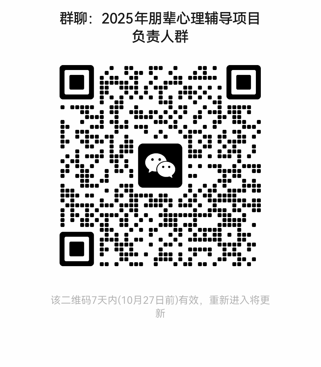 请各项目负责人微信扫码进群:2025年朋辈心理辅导项目负责人群。