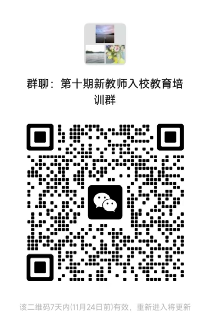 2.请参会教师11月21日上午8:45到会场领取学习资料并进行专题讲座的学习。为方便联络,请参会教师加入“第十期新教师入校教育培训微信群”。
