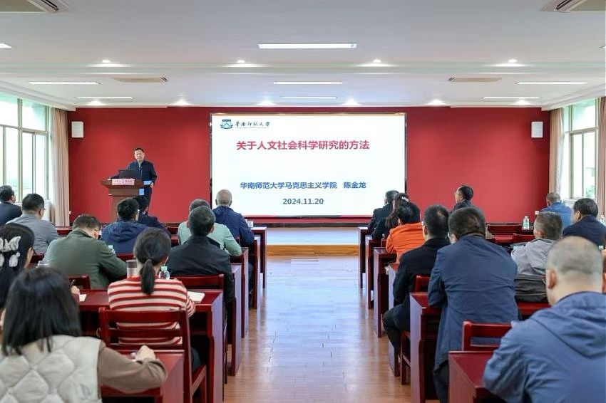11月20日上午,华南师范大学学术委员会副主任、马克思主义学院教授、博士生导师陈金龙,应邀在何侨生大楼526会议室作《关于人文社会科学的研究方法》专题辅导报告。副校长廖志成主持报告会。宣传部、科研处负责人,马克思主义学院、政法学院教师参加了报告会。