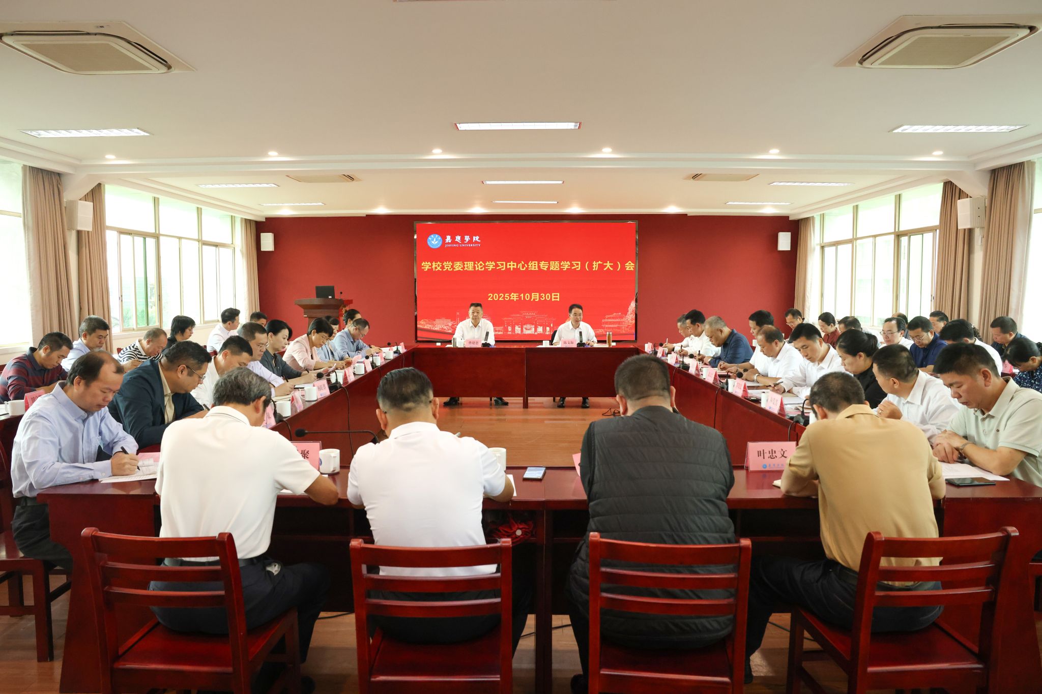 10月30日上午,我校在何侨生大楼526会议室召开党委理论学习中心组专题学习(扩大)会,围绕“深入学习贯彻党的二十届四中全会精神,凝聚推动学校高质量发展的奋进力量”展开专题学习。学校党委书记陈文海主持会议并作学习贯彻党的二十届四中全会精神、《习近平谈治国理政》第五卷和《中国共产党思想政治工作条例》专题发言。校长曹建忠,副校长罗嘉文、张丽霞、廖志成,纪委书记苏文记,相关职能部门主要负责人,各二级单位党委(党工委、党总支、直属支部)书记参加会议。