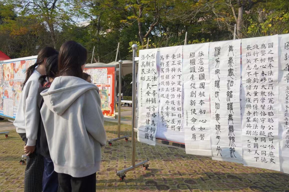据悉,学校于12月1日至7日开展了以“学习贯彻习近平法治思想,推动宪法深入人心”为主题的“宪法宣传周”系列活动,充分发挥办学特色和专业优势,深入实施“宪法卫士”行动计划。丰顺校区、程江校区、黄塘校区及法学与公共事务学院等二级单位积极响应,结合自身实际,通过组织宪法晨读、宪法主题DIY手工作品与书画作品展览、送法入社区普法宣传等活动开展宪法学习宣传活动,在全校上下形成了联动参与、整体推进的宪法宣传教育生动局面,共同营造了“宪法满校园、法治润人心”的浓郁文化氛围,为培养德法兼修的高素质人才、建设更高水平的法治校园奠定了坚实基础。