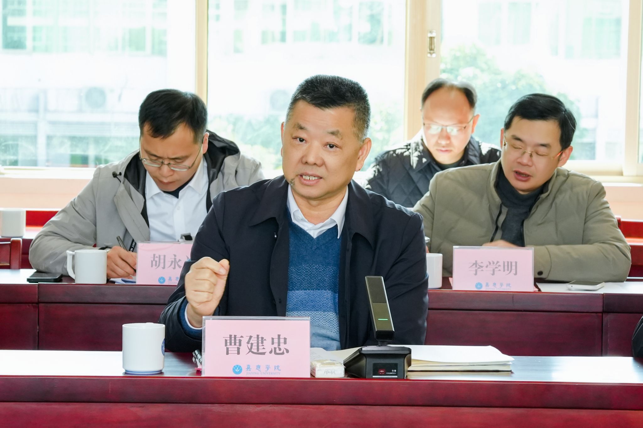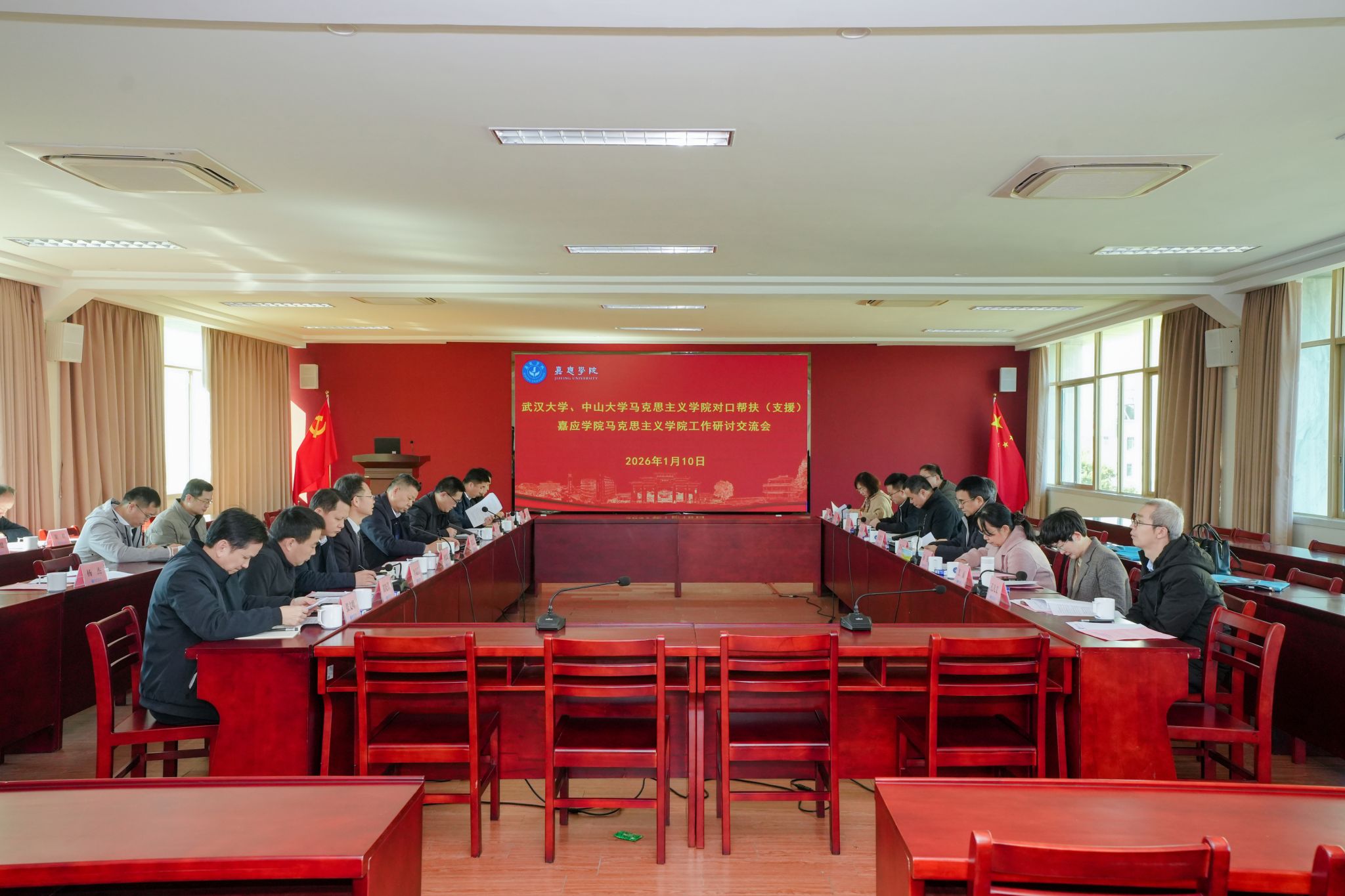 交流环节中,武汉大学、中山大学、嘉应学院马克思主义学院分别详细介绍了各自学院办学定位、学科优势、师资队伍建设及发展经验。随后,三方围绕《对口帮扶工作机制及2026-2028年工作任务清单(讨论稿)》《“党的创新理论与地方实践”学术研讨会筹备方案(讨论稿)》展开深度研讨。