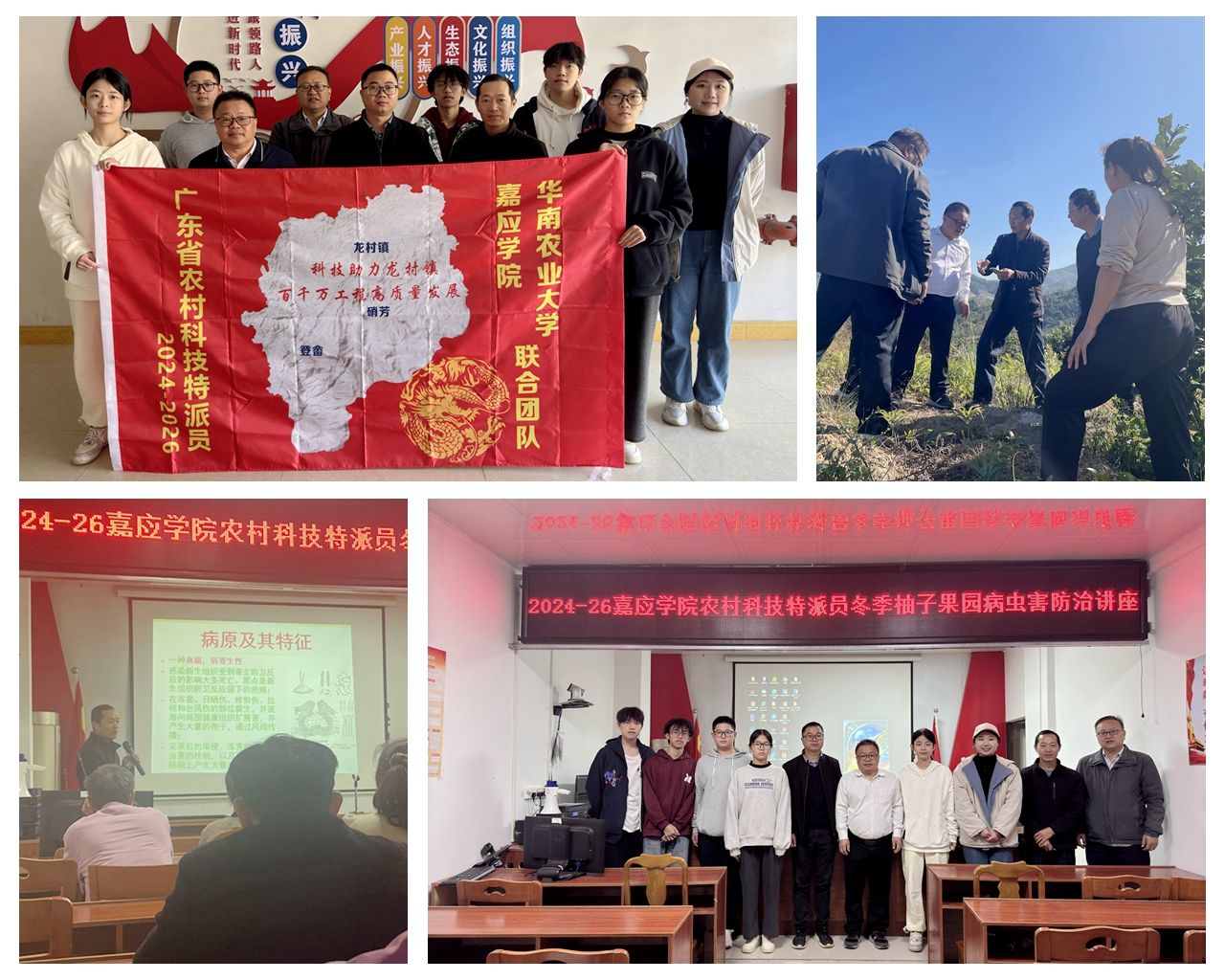 团队结合"双百行动"工作要求,根据果园当前面临病虫害的严峻挑战,发挥专业优势,制定研究方向和工作方案,全力以赴为明年柚子、茶叶和水稻高产丰收筑牢根基。同时,深入龙村镇湖中村绿源生态园展开实地勘探,针对柚子树黄龙病的成因及处理举措展开现场研讨;严谨地验收了无人机飞行喷药效果;开展柚子园冬季清园专题讲座,进一步提升了当地农户的病虫害防控知识水平;积极与当地干部种植户交流,深入了解了果园病虫害发生情况。团队后续还将开展茶叶园地和100亩水稻田秧苖试验区清园和施肥工作。