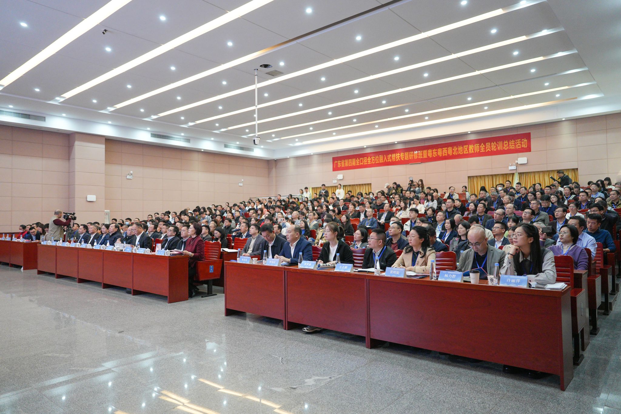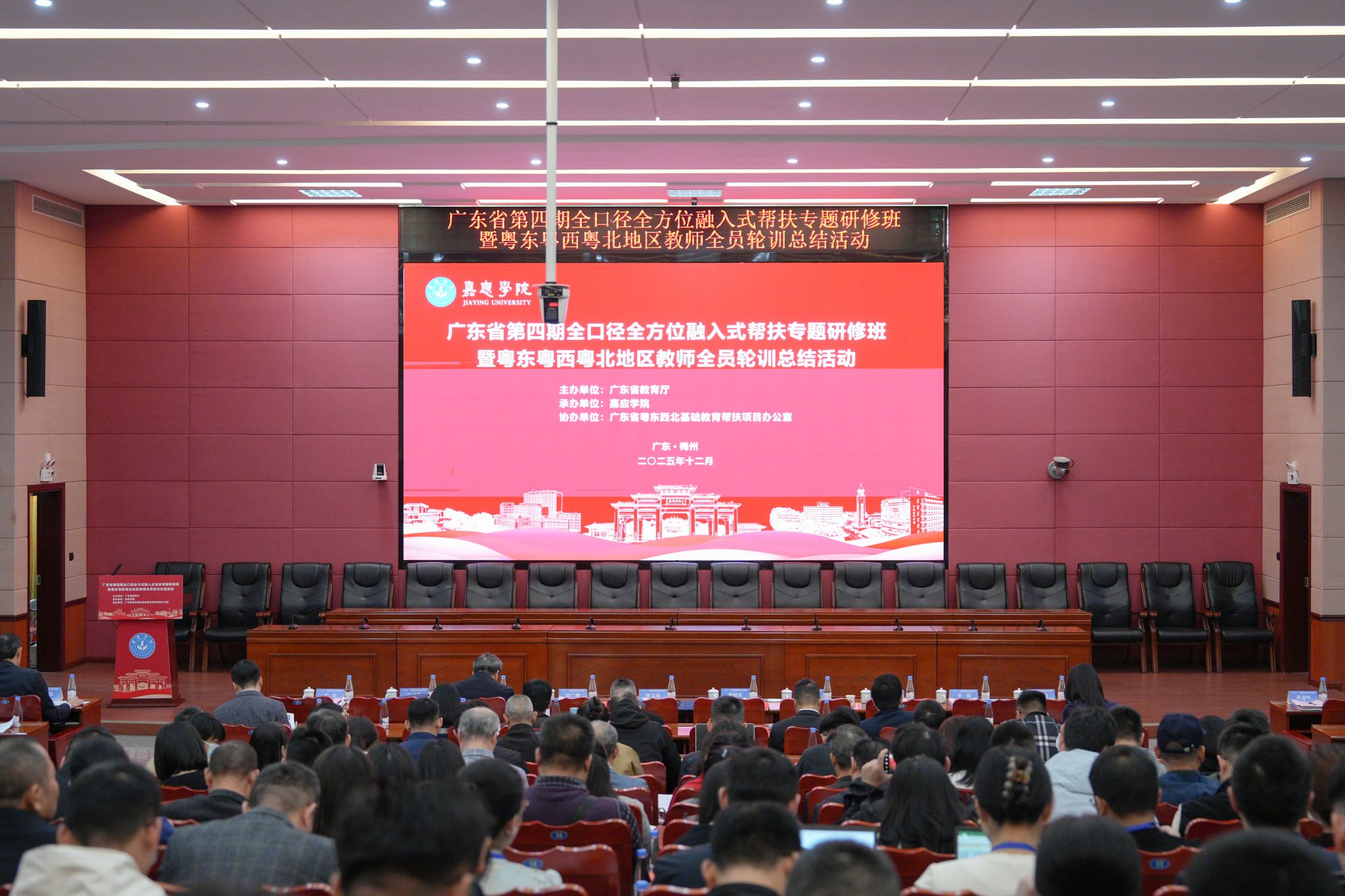 12月8日,广东省第四期全口径全方位融入式帮扶专题研修班暨粤东粤西粤北地区教师全员轮训总结活动在我校开班。此次活动以“‘两全一融’促均衡,‘全员轮训’强根基”为主题,深入贯彻《广东省推动基础教育高质量发展行动方案》,系统总结帮扶与轮训成效,部署下一阶段重点任务。省委教育工委委员、省教育厅党组成员、副厅长李璧亮出席并作主旨讲话。学校党委书记陈文海致辞。学校校长曹建忠、副校长罗嘉文,广东第二师范学院副校长马骏,韶关学院副校长田广增,全省21个地市教育局、高校及项目单位300余名负责人出席活动,共绘教育优质均衡发展新蓝图。